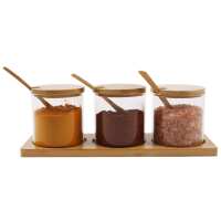 ORNAMI Set of 3 clear Glass jars with Bamboo lid; Spoon and Bamboo Stand; Containers for Spices; Sugar and Salt