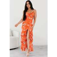 Feminine & Fierce Ruffle Floral Maxi Dress (Red Orange) MEDIUM