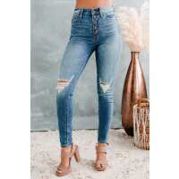 At Some Point Sneak Peek High-Rise 5-Button Distressed Skinny Jeans (Medium Light) 1/25