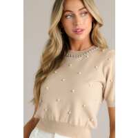 Casual Class Beige Short Sleeve Faux Pearl Top S / Beige