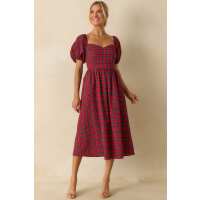 Always You Cotton Red Plaid Puff Sleeve Midi Dress XS / Red