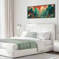 Wide Japanese Horizontal Framed Artwork - Terracotta Teal Mountain Sunrise XL : 100 x 37cm
