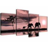 Blush Pink African Sunset Elephants Canvas Wall Art Print 4 Panel / medium