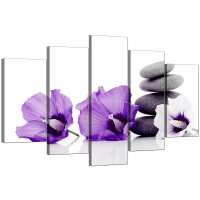Large Purple Grey White Flowers Zen Stones Floral Canvas Art 5 Panel / medium