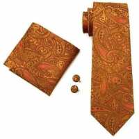 Brown paisley silk neck wedding tie, pocket square & cufflink set