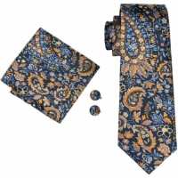 Mens Blue and Orange Floral 100% silk pocket square, cufflink and tie set