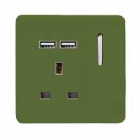 Trendi, Artistic Modern 1 Gang 13Amp Switched Socket WIth 2 x USB Ports Moss Green Finish, BRITISH MADE, (35mm Back Box Required), 10yrs Warranty